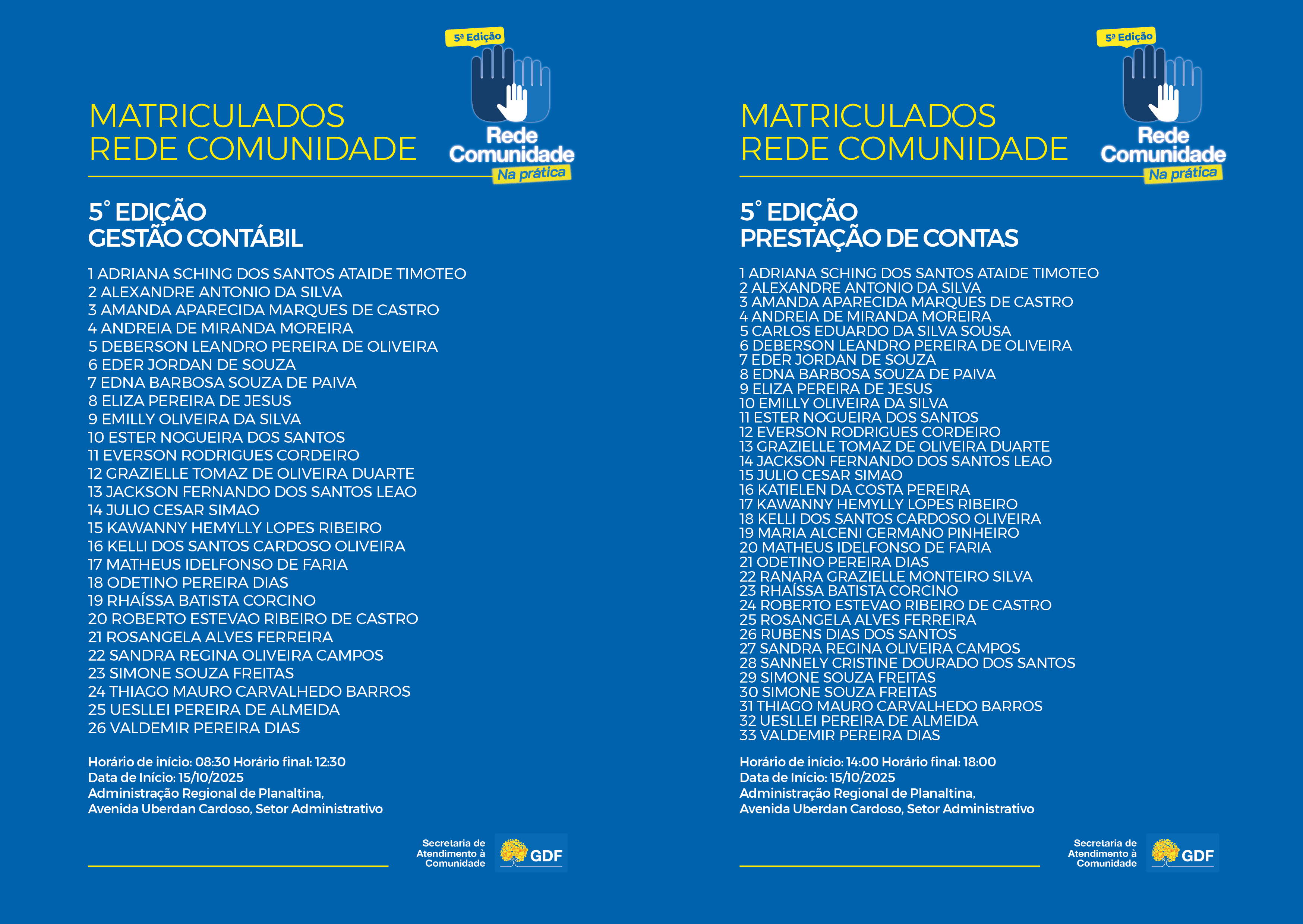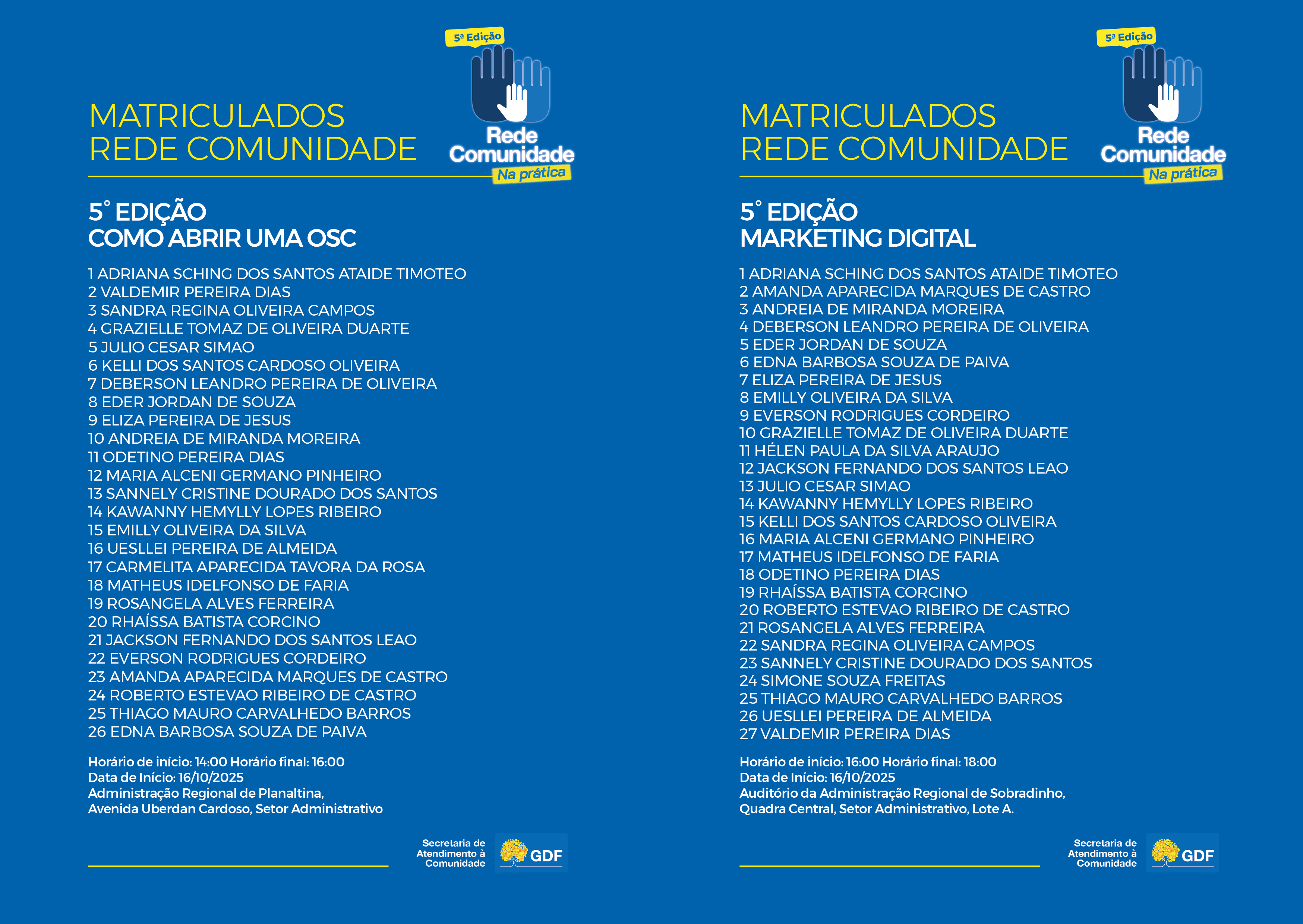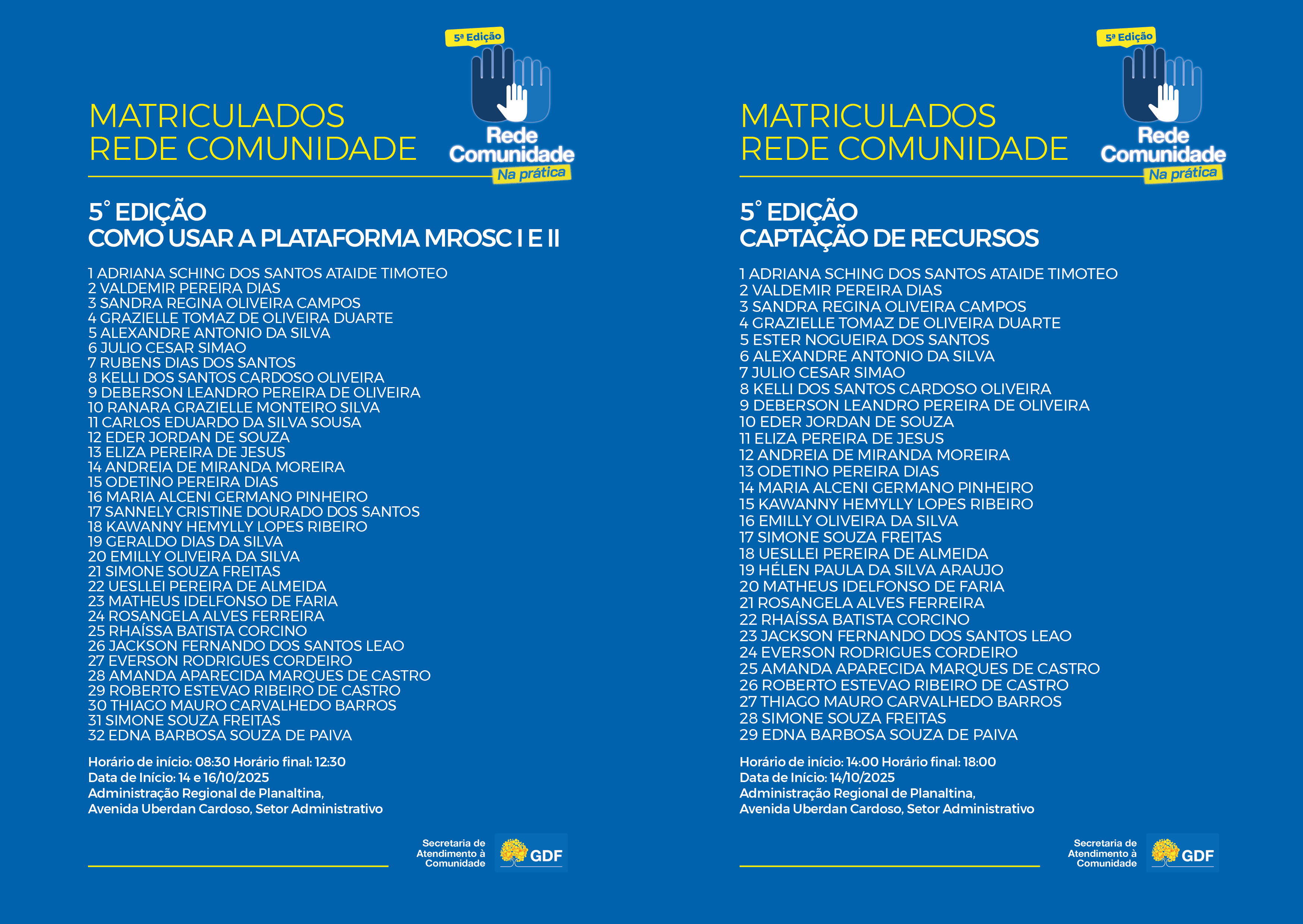 A Secretaria de Atendimento à Comunidade do Distrito Federal (SEAC), em parceria com o Sebrae-DF, promove a quinta edição de 2025 do Projeto Rede Comunidade, dando continuidade à capacitação prática voltada para Organizações da Sociedade Civil (OSCs). O encontro será realizado nos dias 14, 15 e 16 de outubro, no Auditório da Administração Regional de Planaltina.
